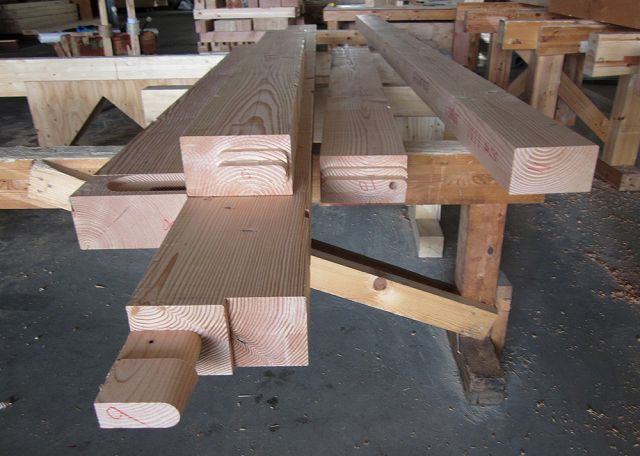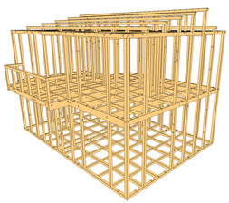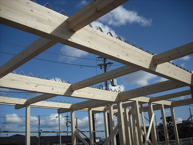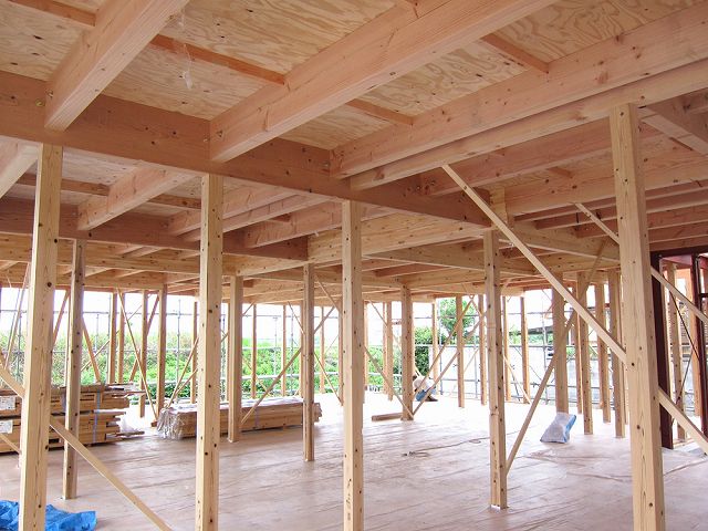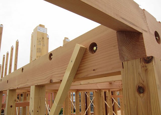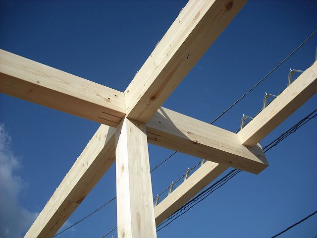 木造住宅の構法としては、最も主流のものです。土台、柱、梁桁の軸となる骨組みで支えるため、木造軸組構法とも呼ばれています。 継手、仕口、ほぞと呼ばれる木材を加工してつくった接合部分を合せてつないでいきます。 プレカット加工機械が世に出る前は、大工職人が鋸やノミを使用して加工していましたが、加工に高度な技術を要する本格的な和室をいくつも持つ家が少なくなってきたためため、最近の住宅の骨組みの加工には機械加工が一般的になってきました。 コンピュータで管理されたCAD/CAMシステムにより、使用する木材量を最小限に抑えながら、精度の高い製品を製造します。 塗り壁等がない家を建てるお客様には、建てた後も変形しにくい集成材や人工乾燥材を使用することをお奨めします。